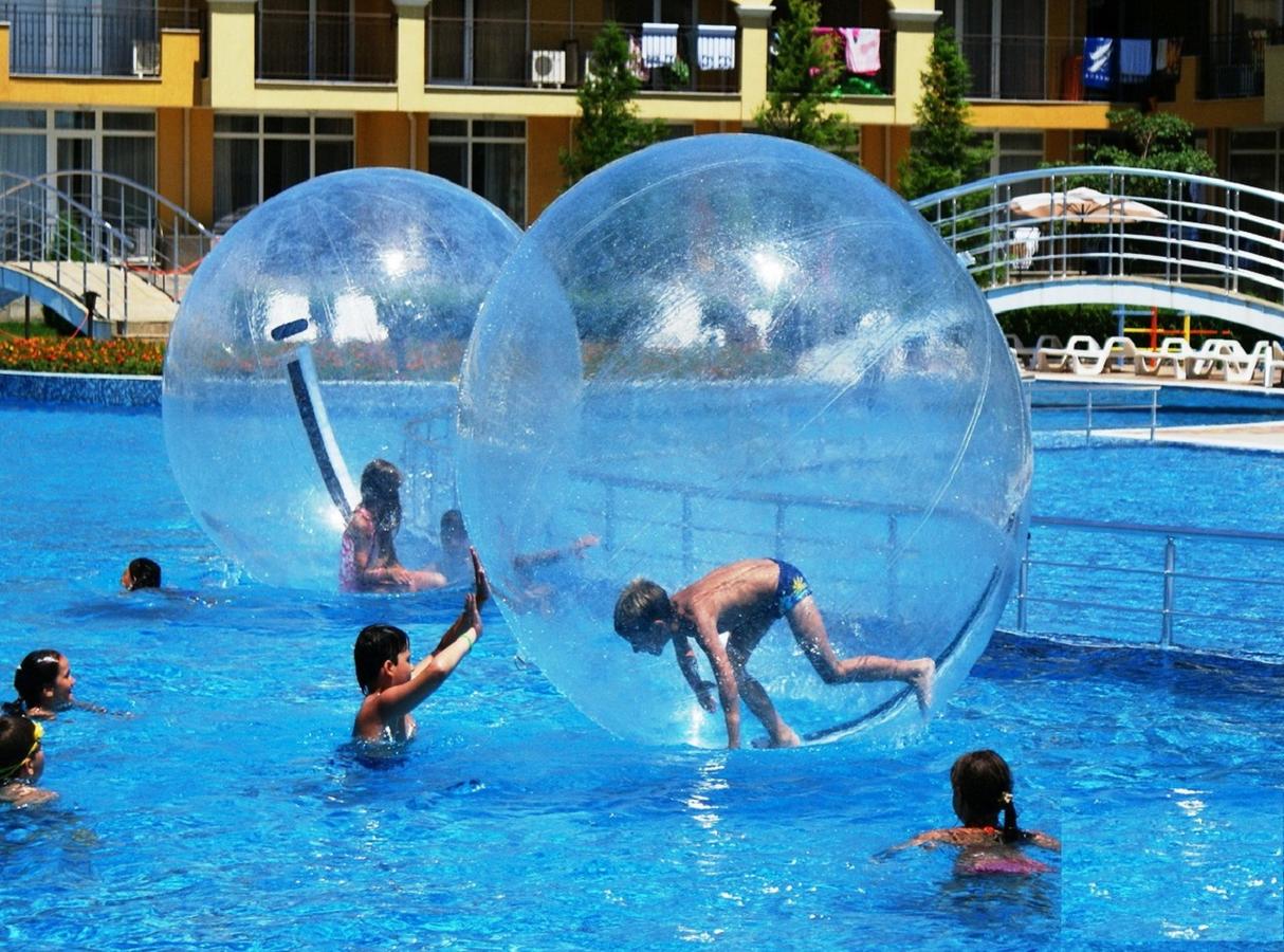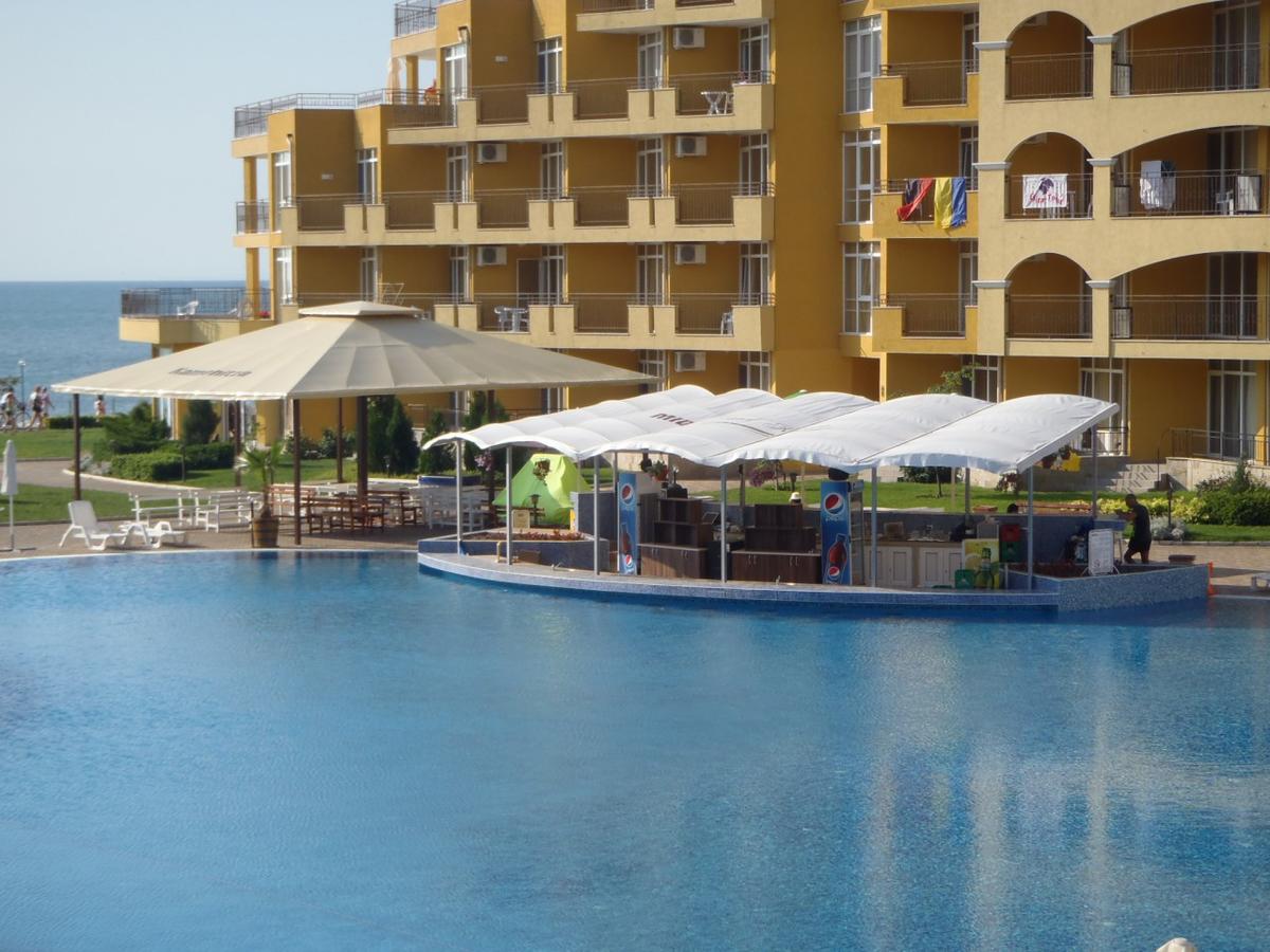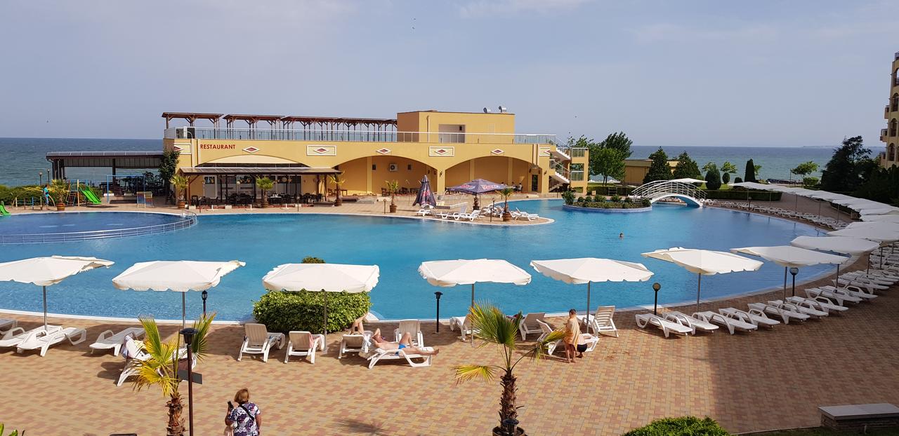 Es gibt viele Wasserattraktionen, hier im Apart-Hotel-Komplex Midia Grand Resort wie: zwei Swimmingpools (mit speziellem Teil für Kinder), Wasserbar für Eltern und herrliches Panorama zum Meer. Jeder Pool ist über 2.400 qm groß.
